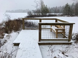 A walk along the well-marked trails in the Round Lake Nature Preserve takes you through a conifer forest and past a variety of deciduous trees, including sugar maple, eastern hemlock, and bigtooth aspen. Some short boardwalks will help you pass through a damp cedar swamp without getting your feet wet. An old wooden sign marked “Lake View Platform” points to a trail that leads to a longer, recently constructed boardwalk, where you’ll walk past a marshy cove covered with lily pads and surrounded by cattails and other marsh plants, and end up at the platform with its unobstructed view of Round Lake.
